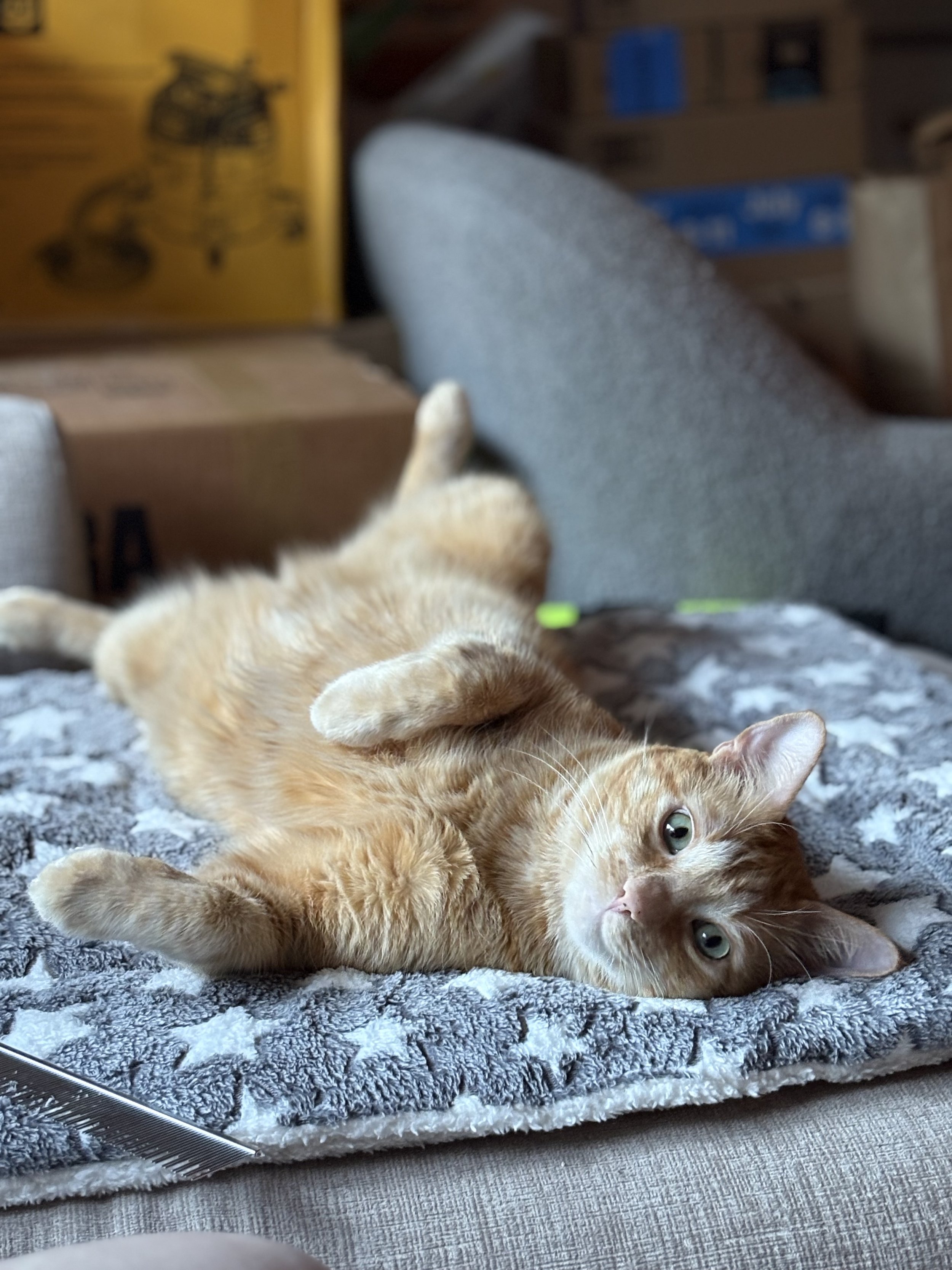 • Orange tabby cat lying on a soft, textured blanket with a star pattern. The cat is relaxed, with its belly exposed and paws slightly curled, looking directly at the camera with calm, green eyes. The background includes gray upholstered furniture.